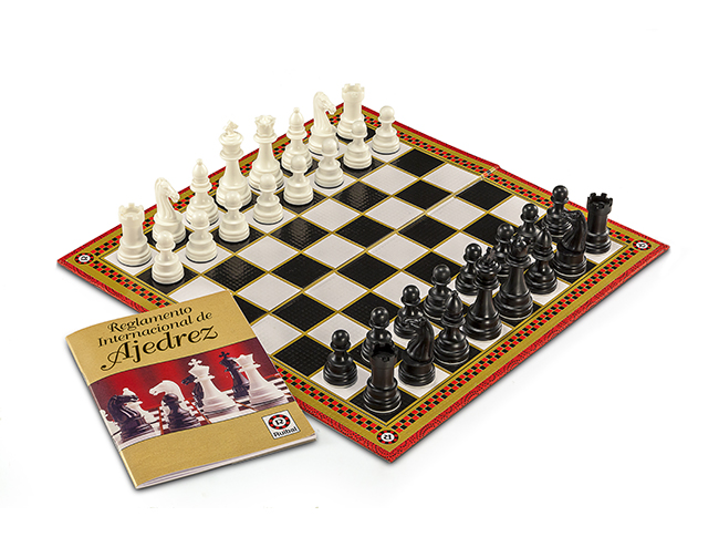 - Contiene: 1 tablero de 350 x 350 mm, 32 piezas plásticas con peso (alt. del Rey: 80 mm), 1 reglamento internacional.