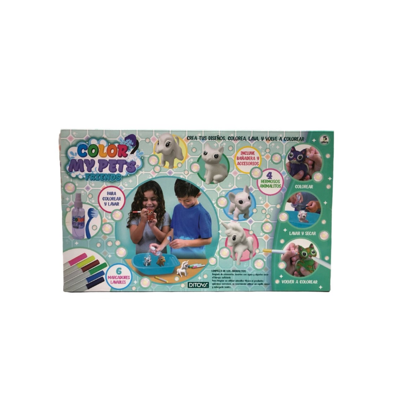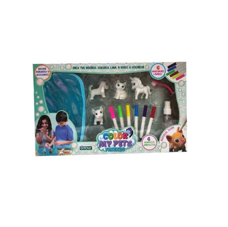 El set incluye 6 marcadores lavables en una amplia gama de colores vibrantes: violeta, verde, amarillo, celeste, rosa y rojo. 4 Mascotas adorables en blanco y negro, una bañera, un cepillo y un frasco spray para que los niños puedan cuidar y mimar a sus mascotas. Después de colorear y personalizar, los pequeños artistas pueden sumergir a sus mascotas en la bañera, cepillar su suave pelaje y usar el frasco spray para darles un brillo especial.