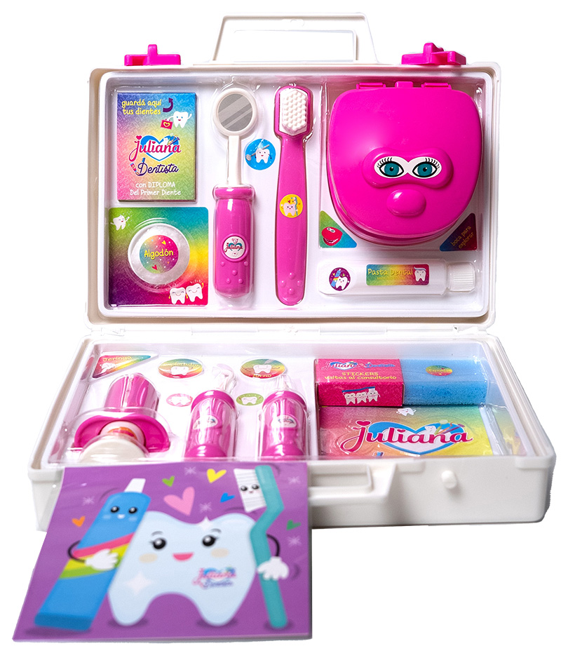 Boca con dientes y stickers para jugar a que son caries, cepillo, espejito, torno, explorador, jeringa, stickers de visitas al consultorio, diploma del primer diente, pasta de dientes (ficticia), gráficas para tu propio consultorio y un librito para enseñarte la mejor forma de cuidar tus dientes y cómo se llama cada uno de ellos.