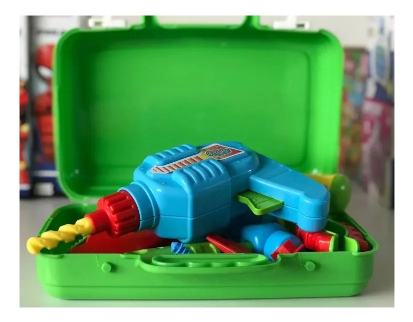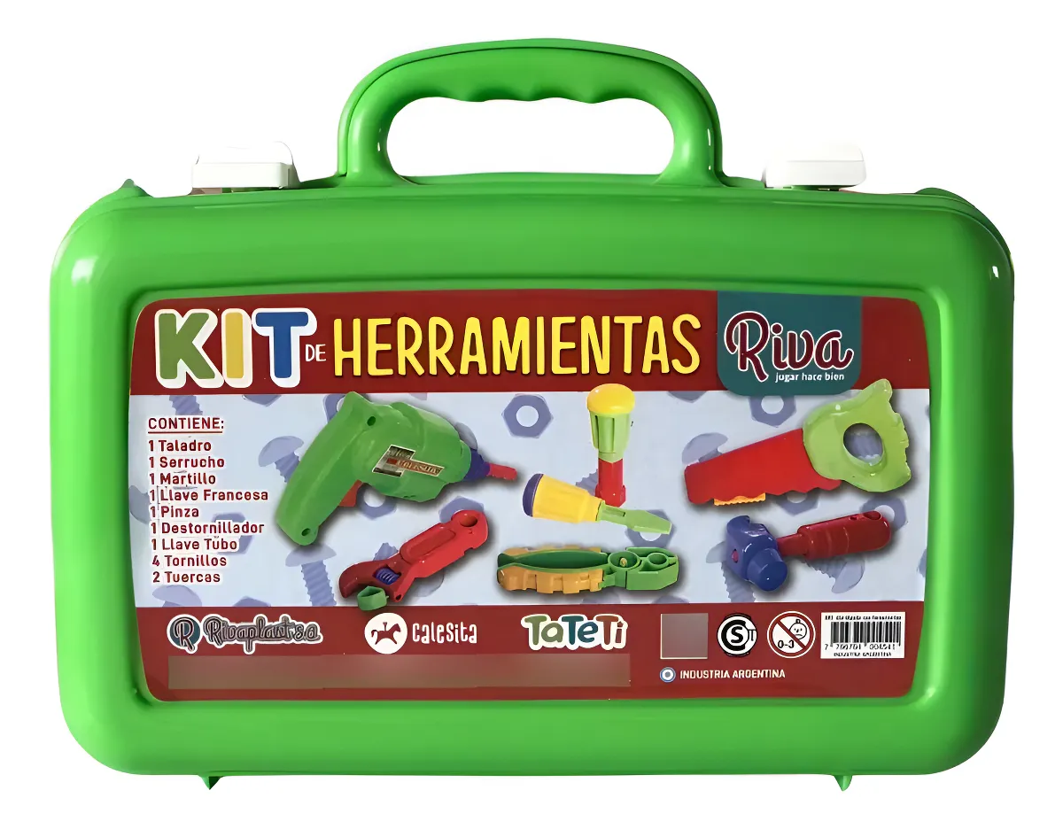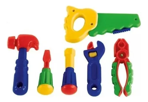 Incluye: 1 taladro, 1 serrucho, 1 martillo, 1 llave francesa, 1 pinza, 1 destornillador, 1 llave tubo, 4 tornillos y 2 tuercas.