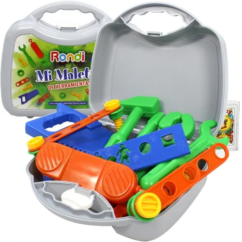 Mi maletín de herramientas rondi con accesorios Incluye: un serrucho, un telefono, una regla, unos tornillos, una llave inglesa, un destornillador, una tenaza, un martillo, unas tuercas y unas arandelas.
