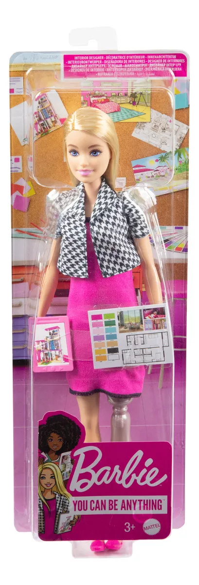 Explora un mundo de diversión en el diseño de interiores con la muñeca de diseño de interiores Barbie. Cuando los niños juegan con Barbie, imaginan todo lo que pueden llegar a ser, y para aquellos que aman los interiores, el color y el diseño, ¡pueden ser diseñadores de interiores! La muñeca diseñadora de interiores Barbie luce un conjunto de temática profesional que incluye un vestido rosa y una chaqueta de pata de gallo recortada, además de zapatos planos rosas a juego. La muñeca diseñadora de interiores Barbie tiene una pierna ortopédica y viene con una tableta de computadora y una hoja de colores de diseño para reproducir momentos profesionales.