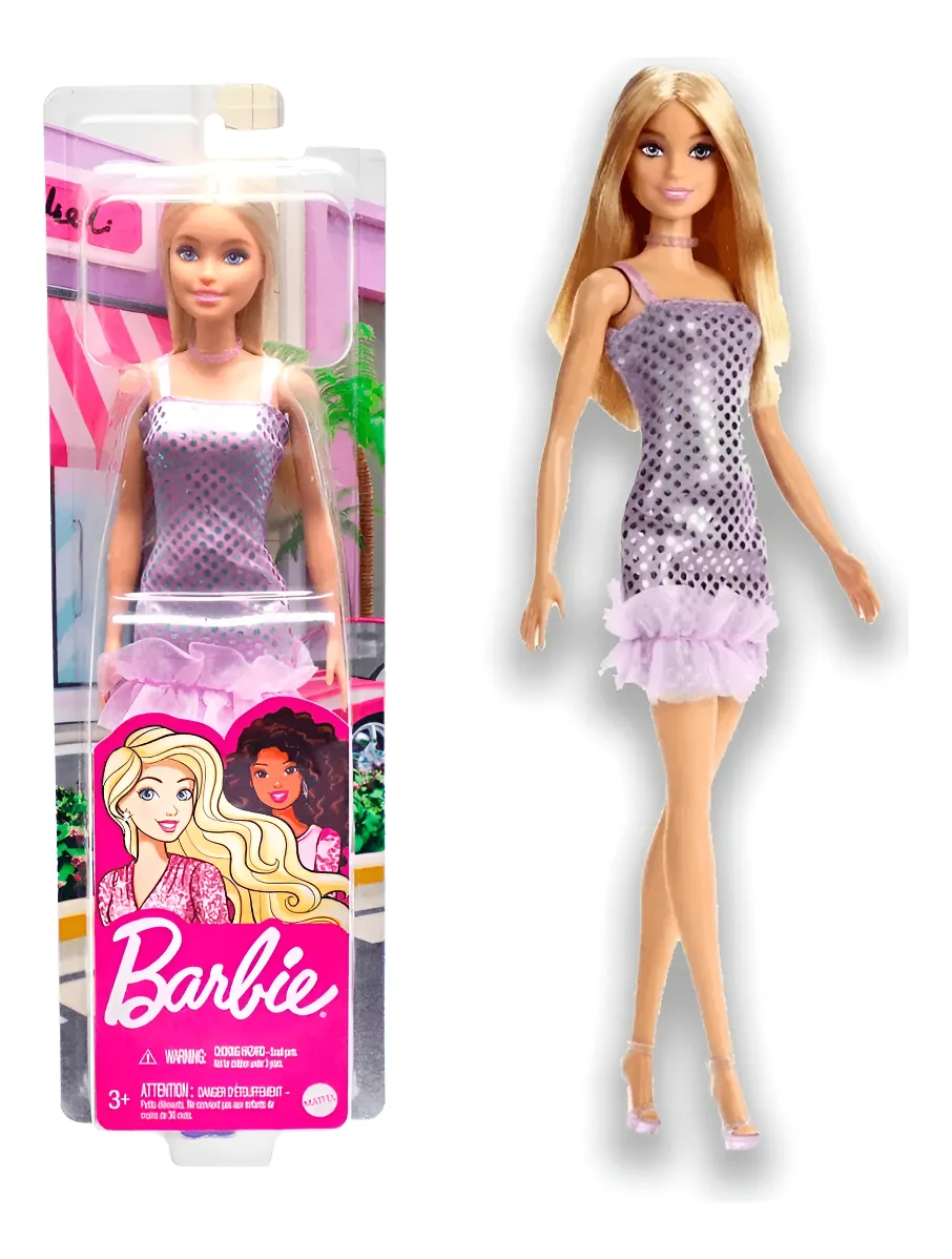 Barbie Fashion & Beauty Muñeca Glitz Vestido De Noche Lila’ es un juguete que deslumbra con su atuendo con lentejuelas y completamente adornado con detalles metálicos. Ademas viene con una gargantilla que combina y estiliza los tacones, ¡completan el conjunto para cualquier fiesta o evento especial!