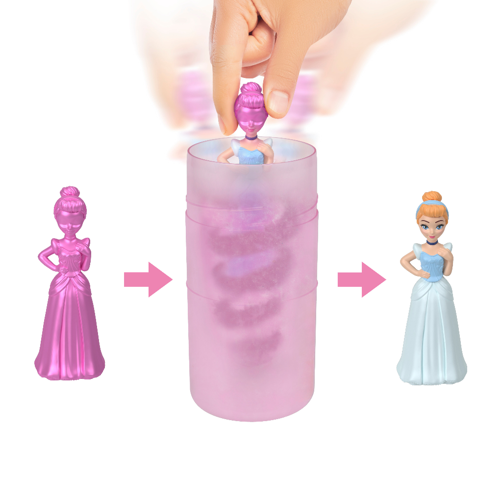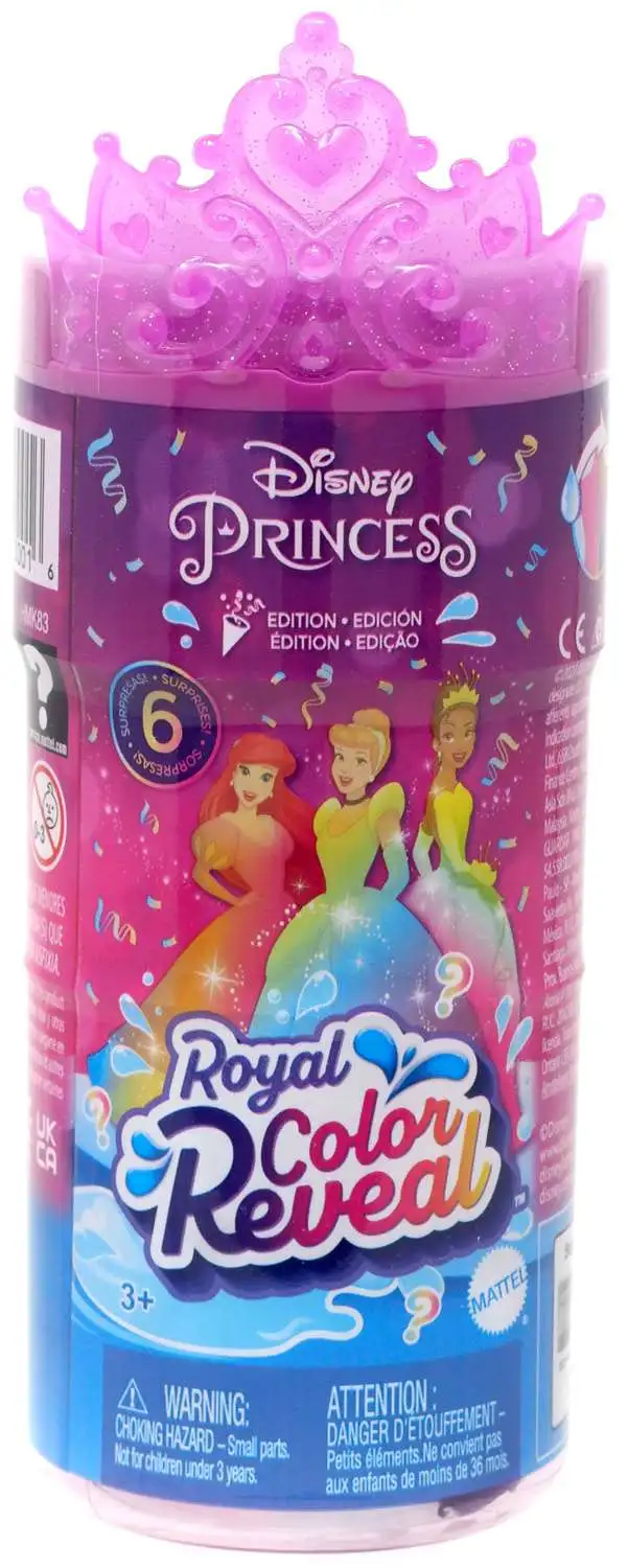 Llega una emocionante experiencia de desempaquetado con las muñecas pequeñas Princesas Disney! A los fans les encantarán las muñecas Royal Color Reveal, pero ¿qué Princesa les tocará? Cada muñeca es un misterio hasta que se les añade agua, lo que activa la tecnología Color Reveal. Cinco sorpresas más incluyen una falda suave, un anillo para la niña y piezas de juego con temática de fiesta. Cada muñeca se vende por separado y está sujeta a disponibilidad. Las muñecas no se tienen en pie solas. Edad recomendada:+3Años.