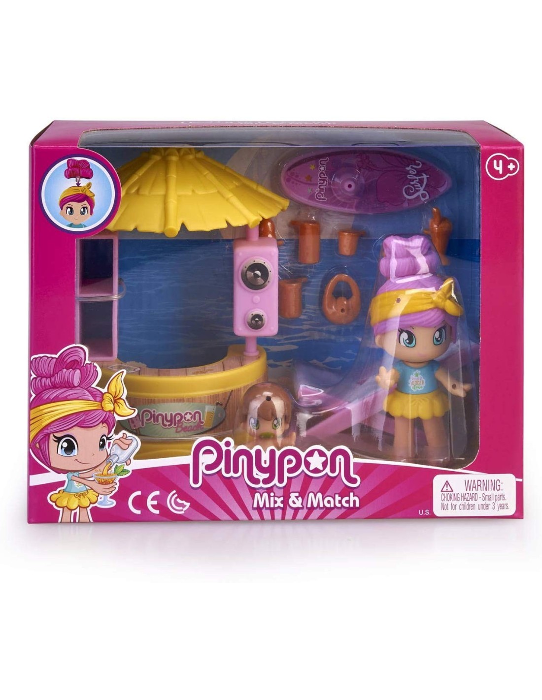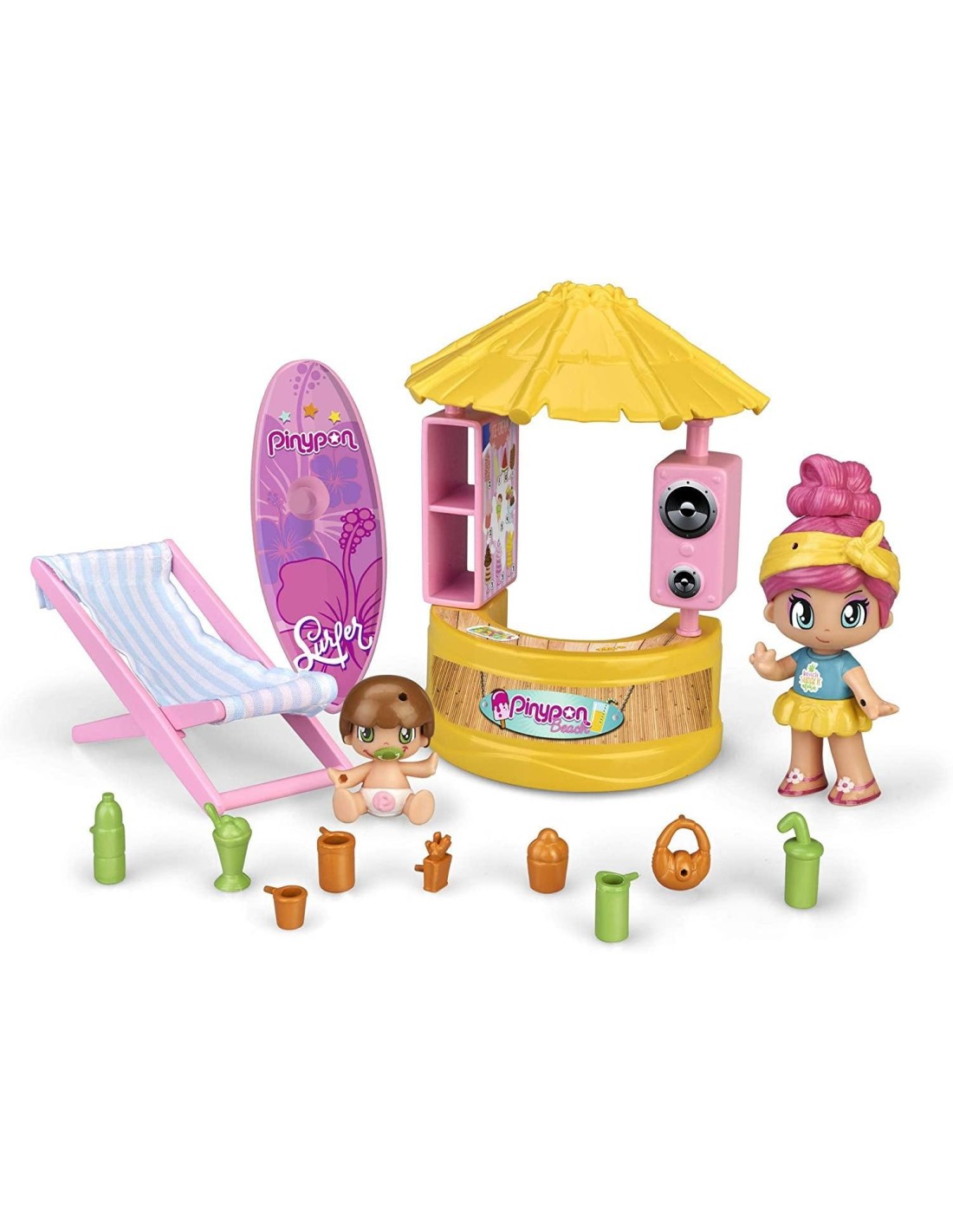 Pasa un día relajante en la playa con los pinypon, tomando el sol. En el kiosco podrás preparar bebidas y ricos helados para refrescarte del intenso calor.