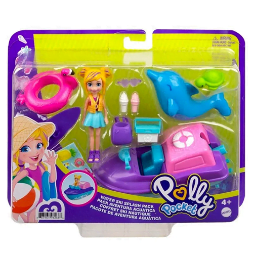 La Muñeca Polly Pocket aventuras acuáticas es el set perfecto de entretenimiento para niños y niñas a partir de los tres años, este set incluye: 1 muñeca Polly, 1 traje de baño deportivo y barco, 1 tabla de esquí acuático, un flotador de flamenco y amigos como 1 delfín y 1 tortuga, los accesorios adicionales incluyen: 1 toalla de playa, nevera portátil, medallón, 2 helados y atuendos adicionales. El barco cuenta con un botón rosa/blanco para que la muñeca Polly gire de forma divertida. (El barco no flota en el agua).