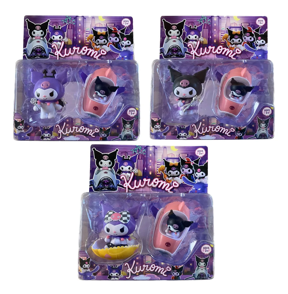 Incluye una figura clásica de kuromi y una figura con vehículo.