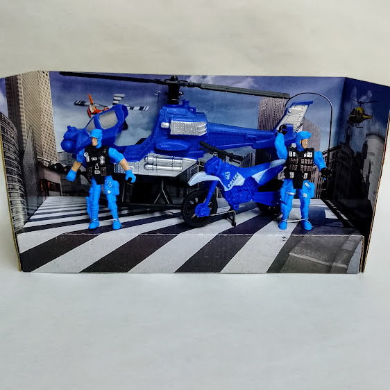 - Incluye: 2 muñecos, 1 helicóptero, 1 moto.