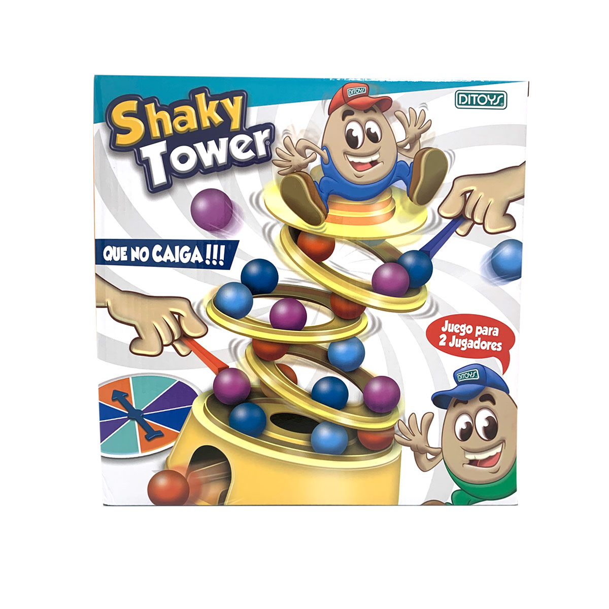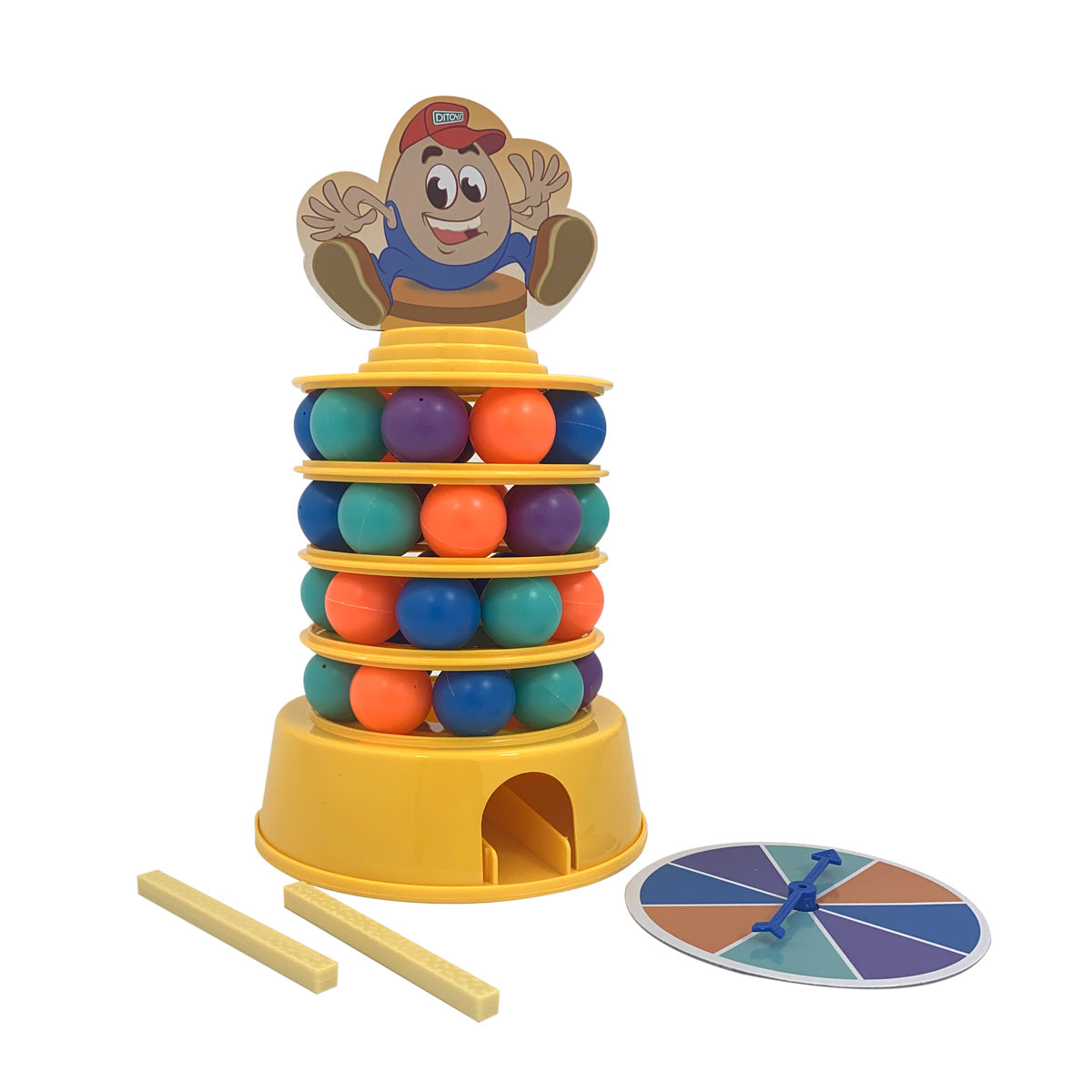 Los jugadores deben retirar pelotas de colores con palitos, según el resultado de la ruleta, sin que la torre se caiga.