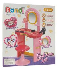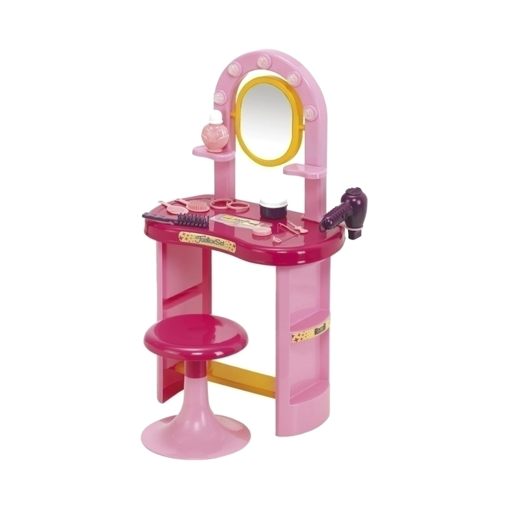 Tocador con espejo regulable, banquito, cassette de maquillaje para pintarse de verdad y peine, cepillo, pulseras, anillos, frasquitos de perfume y un cajoncito para guardar ordenadamente todas sus cosas.