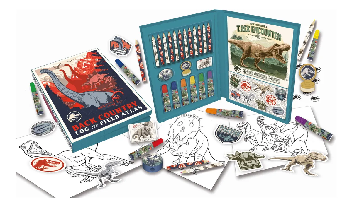 Pintá y jugá con las imágenes de grandes dinosaurios y vive una aventura jurásica con este increíble set de arte.