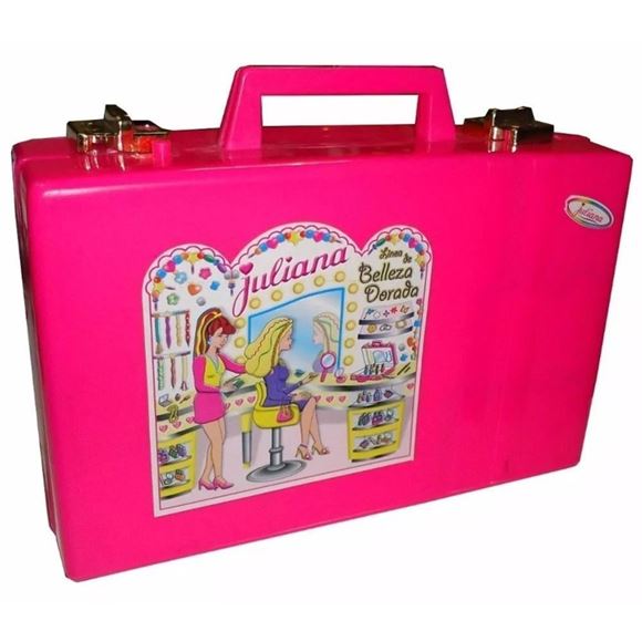 Con la Valija de Juliana Línea Dorada la niña va a sentirse una señorita… Podrá pintarse las uñas, los labios, ponerse sombra en los ojos y también tendrá la opción de pegarse unas hermosas uñas autoadhesivas entre muchos tantos accesorios de belleza que trae la Juliana Línea Dorada Grande.