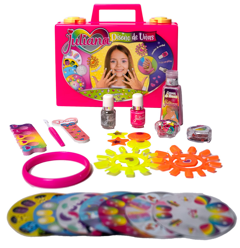Incluye:2 esmaltes (1 flúo y 1 top coat glitter), separador de dedos, lima, repujador, crema de manos, deco, discos de uñas postizas x2 con cinta bifaz para pegarlas, mini tatuajes y más de 80 stickers para las uñas, pulsera de plástico y dijes para armar pulseras y completar tu look.