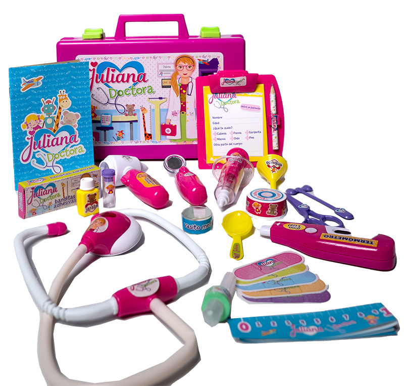 Estetoscopio, otoscopio, bajalengua, jeringa, termómetro, banditas, tijera, cinta, ficha de paciente y un librito para ayudarte a ser la mejor doctora del mundo!