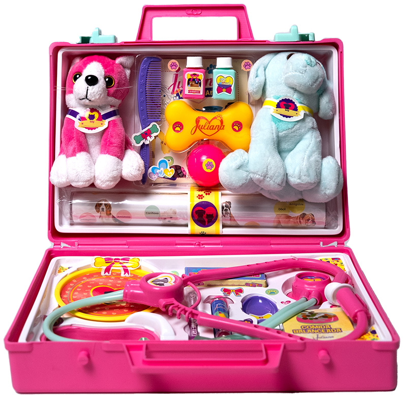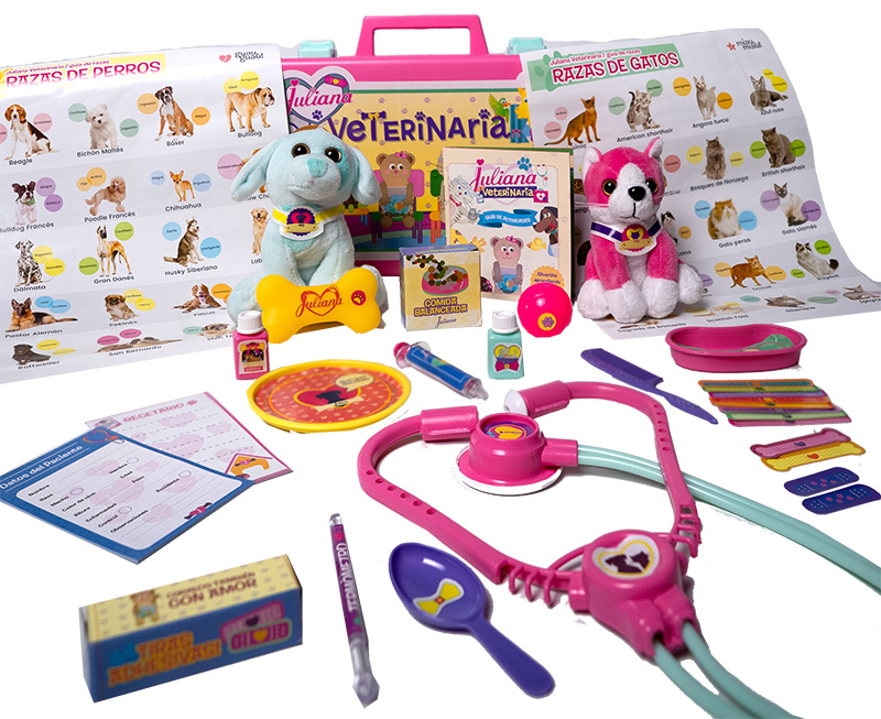 Mascotas de peluche (gato y perro), estetoscopio, jeringa, termómetro, peine, huesito y pelotita de juguete, recipiente para shampoo de perro y gato, bandeja para perro y gato, caja de comida balanceada, cuchara, tiras adhesivas, un librito de actividades sobre animales y un póster informativo sobre las diferentes razas.